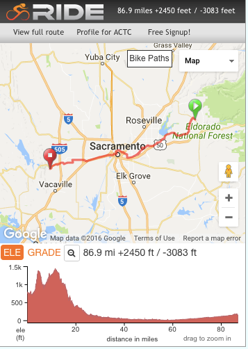 Day 2 is our reward for conquering the sierra’s but begins with a 700’ climb out of camp to put us on a mostly downhill leisurely cruise on quiet mountain backroads. Today we climb 2700’ but descend more than 9200’ arriving at the South Fork of the American River. The route travels along the Mormon Emigrant Trail, Pony Express Trail, Kit Carson Road, and the El Dorado Trail. This is the “Ponderosa” of the 60's. The route leaves the El Dorado Trail to follow Coloma Road through old town Placerville providing many snacking opportunities before continuing down to the river. Camp is a stone's throw from the river at the American River Resort where screams of white water rafters can be heard in the afternoon as they pass by. The gold discovery site of Sutter's Mill is a short walk or ride from the camp, as are several local shops and restaurants. Be on the look-out for gold nuggets if you go.