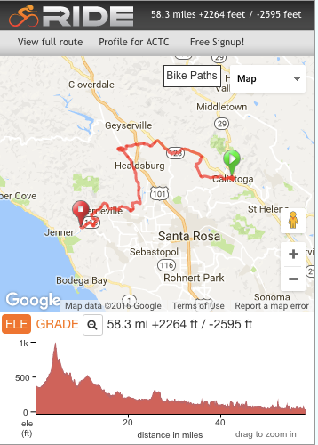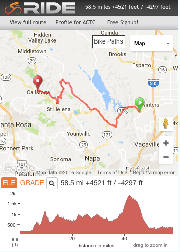 Day 4 continues west via Hwy 128 and crosses the tour’s half way point. It climbs past Monticello Dam then up and over "Cardiac Hill" in Napa County. “Cardiac Hill” was coined by Iron Man Dave Scott as the best road in the area to get a good cardiac work out. Rest stop 1 is at Turtle Rock Bar and Grill, well worth a peek inside. Head north through vineyards and forest into Pope Valley and a shaded 4 mile 1000’ climb up Ink Grade Rd. Luckily, rest stop 2 at the Clif Family Farm is half way to the top. Your efforts will be rewarded with a magnificent descent into the Napa Valley, one of the most scenic of the tour, followed by a short 6.5 mile roll into camp along Silverado Trail. Camp is at Napa County Fairgrounds but Calistoga provides a great opportunity for a mid-week hotel splurge! Dinner tonight is on your own at one of the many great restaurants located downtown.