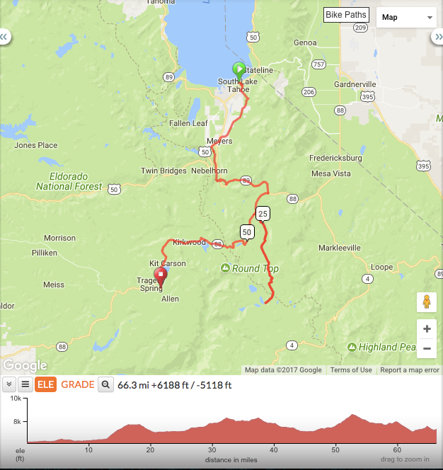 Day 1 is our chance to do some real High Sierra climbing over two mountain passes. Starting from the shores of Lake Tahoe at 6300’ the route follows Pioneer Trail to a picturesque climb on a narrow quiet mountain road up Luther Pass summiting at 7740’. Your legs won’t complain about the 10% grades because your eyes will be entranced by unbelievable stunning scenery surrounding you. After a decent down the other side of Luther Pass you can explore an optional journey along another seldom traveled road to Blue Lakes. After a short rest at the lakes we tackle the bigger climb over Carson Pass summiting at 8652’ with a few more 10% grades towards what seems the top of the world. Descending the other side, we pass Caples Lake and Kirkwood Ski Resort before summiting two more smaller climbs to get us to camp at Silver Lake. Today you can be proud of 6200’ of climbing with the lake option or 4500’ without.